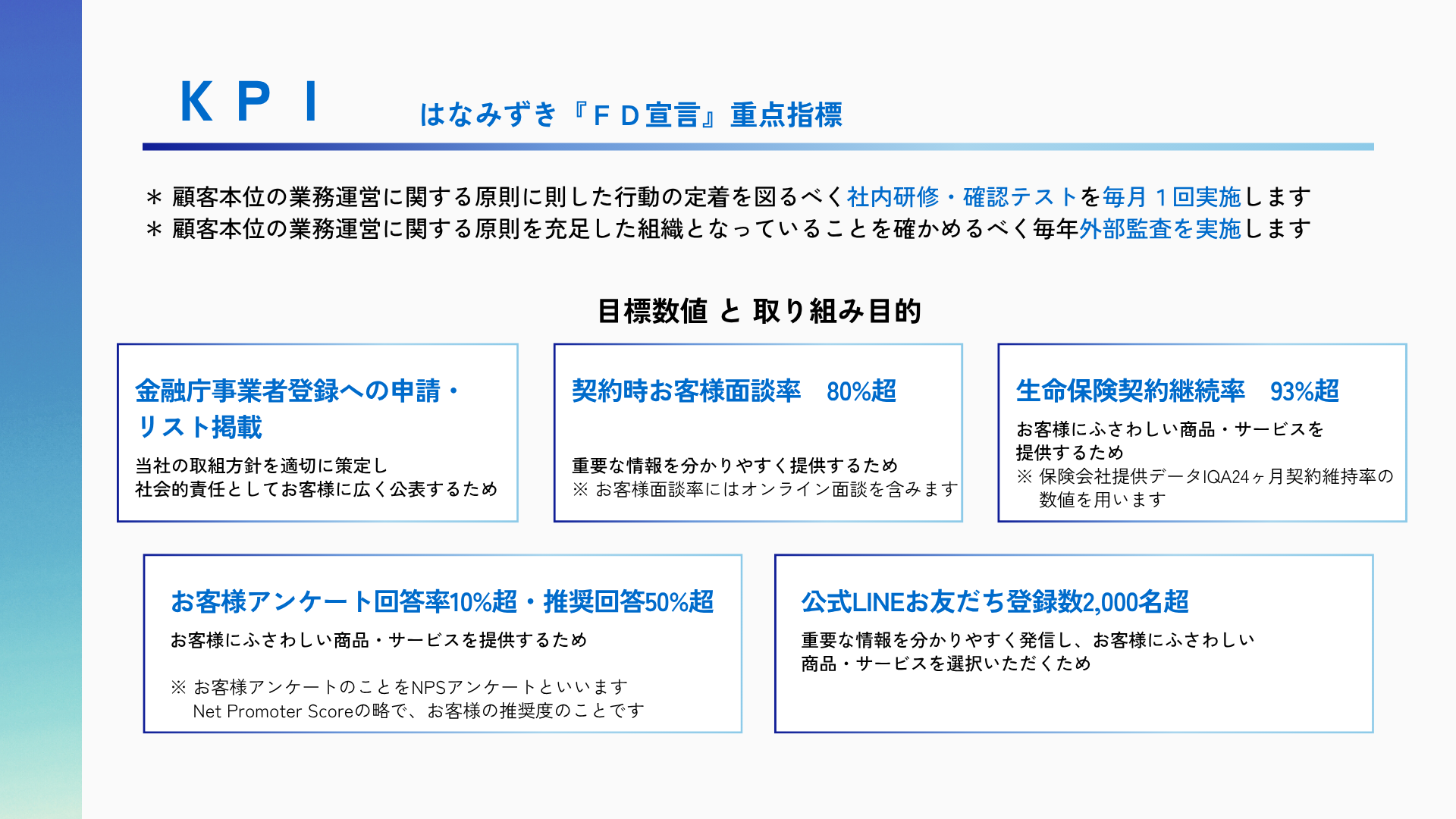 ついては、ここにお客さまとのお約束の証として「お客様本位の業務運営方針『FD(フィデューシャリー・デューティー)宣言』」を策定し、この方針が自社組織にて適切に取り組みがなされ、運用されているかを検証するための『基本品質指標(KPI)』を定めて各年度単位で検証を行ない、より良い改善につなげて参ります。