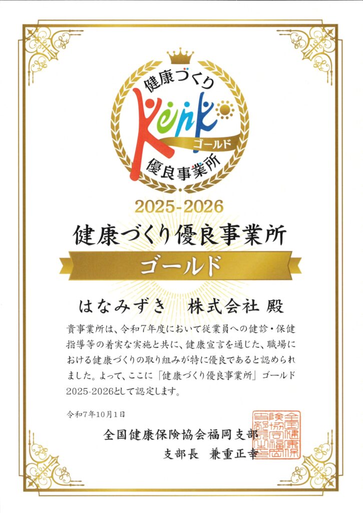 この度はなみずきの令和6年度職場における健康づくりを評価していただき、全国健康保険協会福岡支部より『健康づくり優良事業所ゴールド認定』を拝領いたしました。